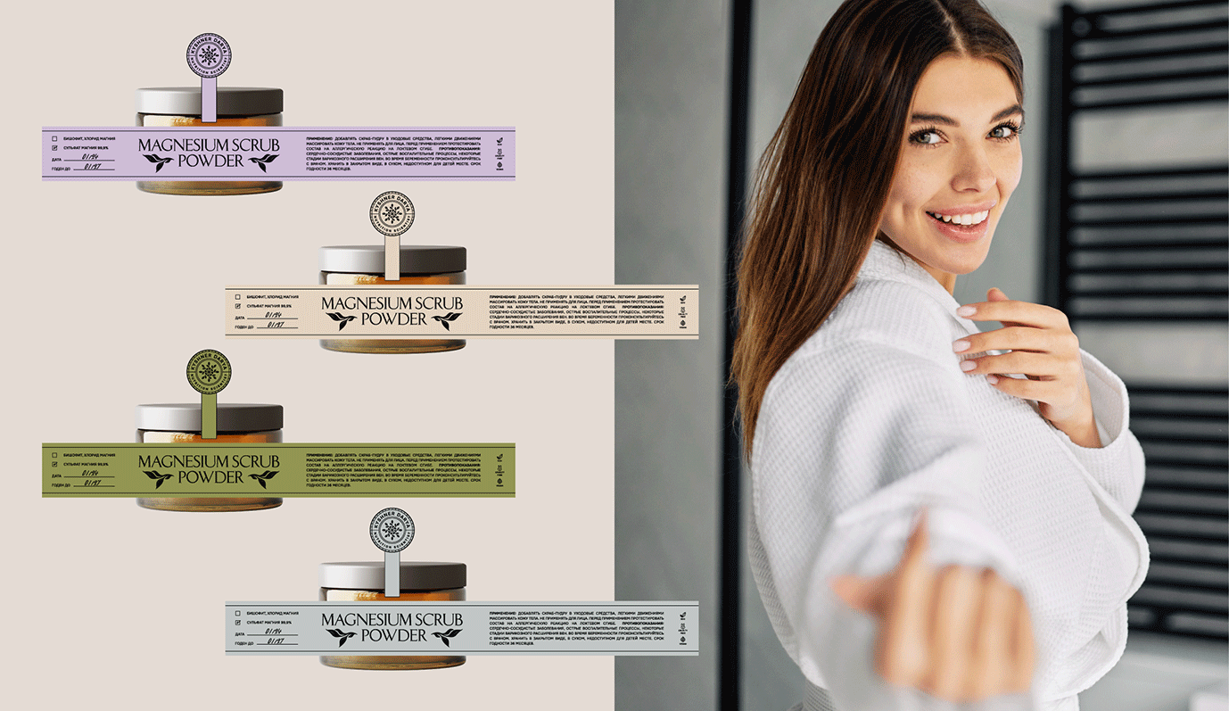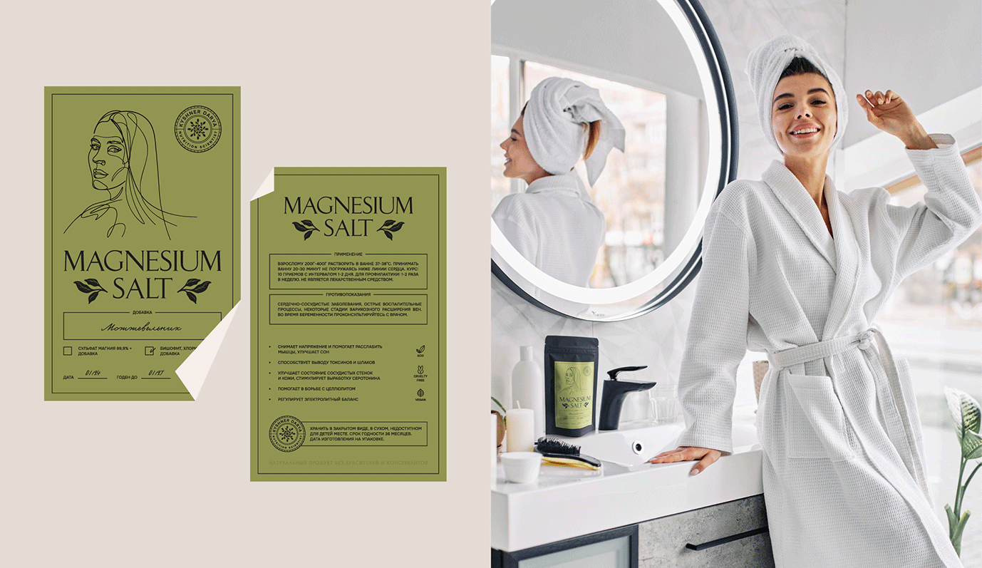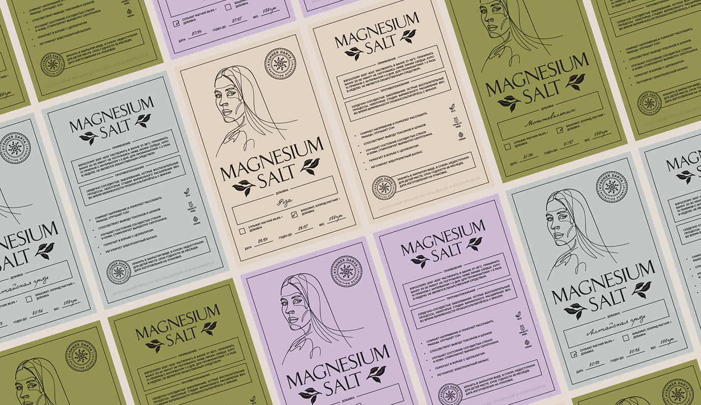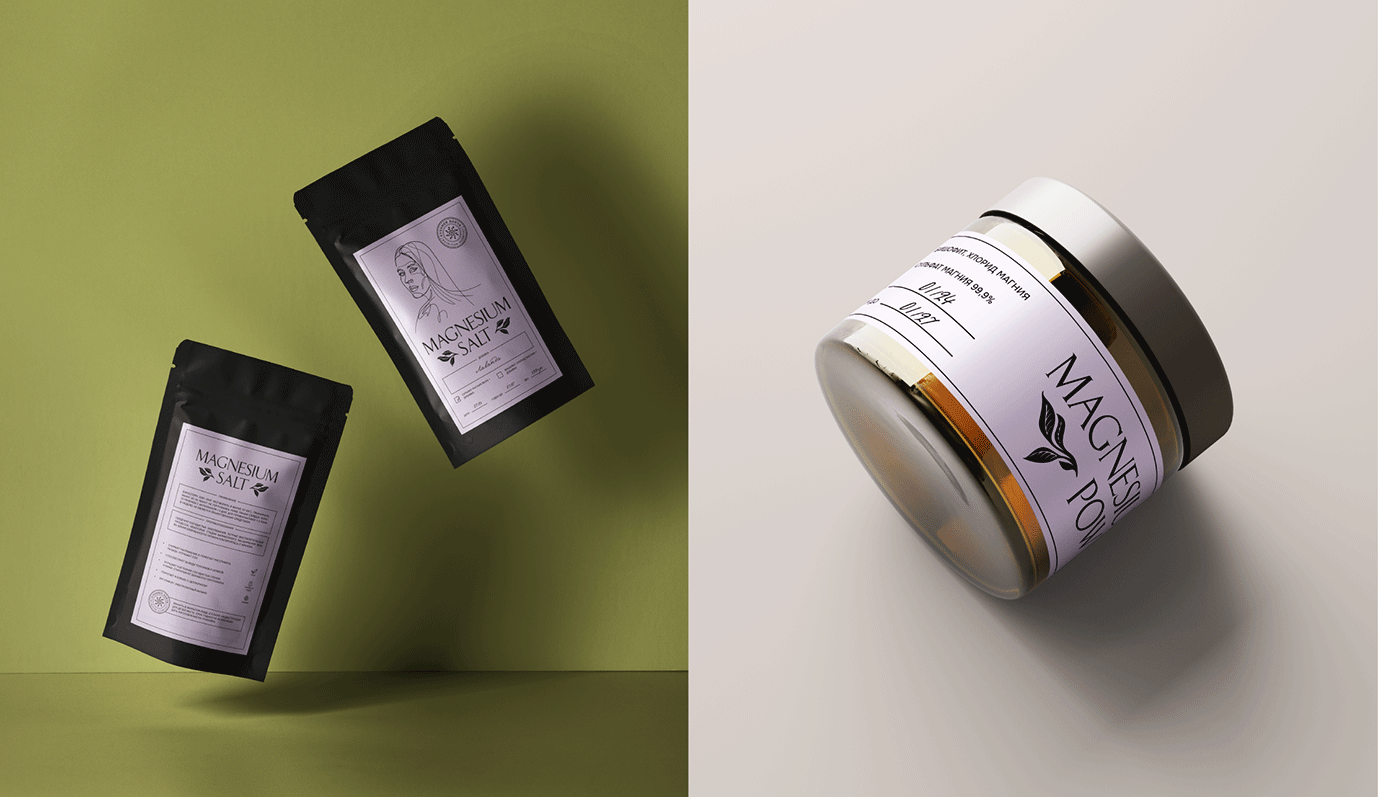 Задача: Создать логотип и упаковку для уникального продукта — 100% натуральной магниевой соли для ванны с природными добавками. Логотип в форме круга с изображением веток и листьев в форме печати удобен для использования в социальных сетях. Этикетка для зип-лок пакетов включает линейный портрет самой Дарьи, эстетичные линии и природные цвета: лиловый, оливковый, молочный и нежно-голубой, создавая привлекательный и гармоничный дизайн, выделяющий натуральность продукта.